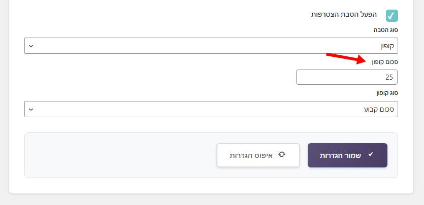 עבור קופון – סכום ההנחה או אחוז ההנחה.