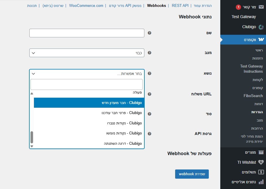 מערכת Webhooks מאפשרת לכם לקבל התראות בזמן אמת על אירועים המתרחשים במועדון הלקוחות. אנו משתמשים בממשק ה-Webhooks הטבעי של WooCommerce לניהול קל ונוח.