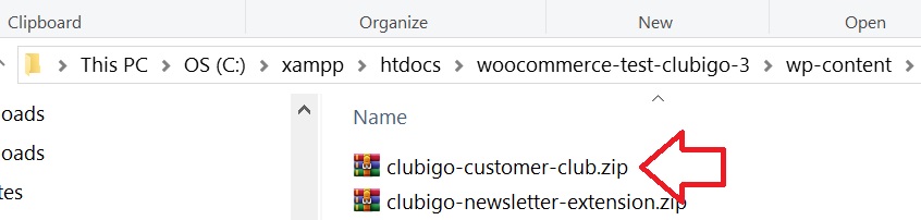 לאחר מכן בחר את קובץ ה-ZIP של Clubigo מהמחשב.